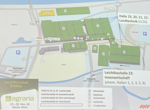 Die AGRARIA, Österreichs Leitmesse für die Landwirtschaft, findet nach vier Jahren wieder von 25. bis 28. November statt. „Alle Hallen, inklusive der neuen Messehalle 22, sind bereits voll belegt. Zusätzlich werden drei Mobilhallen mit rund 15.000 m² Ausstellungsfläche errichtet“, so Messedirektor Mag. Robert Schneider. Der Hallenplan (Bild) verdeutlicht die Wichtigkeit dieser Messe.