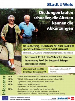 Die Stadt Wels startet dazu eine Aktionswoche, deren Kernpunkt eine Info-Veranstaltung am Donnerstag, 18. Oktober, um 19.00 Uhr in der Sparkasse (Ringstraße 27). Zu Gast sind Burgschauspielerin Prof. Lotte Tobisch-Labotyn (Botschafterin des EU-Jahres), Prof. Dr. Leopold Stieger (Personalentwicklung-Pionier und Senioren-Aktivist), Mag. Erich Rondonell (Vorstandsdirektor a.D.), Renate Pyrker (Geschäftsführerin Austria Plastics) und Sporttherapeut Dr. Josef Wiesauer. Tipp: Klick auf das Foto.