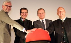 Mit der markanten Gestaltung setzt der Tourismus-Leitbetrieb wiederum neue Maßstäbe in der Wellnesshotel-Landschaft fort, unterstreicht die Tourismus-Bedeutung im Salzkammergut und trägt maßgeblich zu dessen erfolgreicher Entwicklung bei. Das Land Oberösterreich und sein Tourismus-Leitbetrieb sorgen zusätzlich für eine regional so bedeutende Umweg-Rentabilität. Bild. Michael Strugl, Markus Achleitner, Thomas Stelzer und Hoteldirektor Andreas Nöhammer sorgten für den "Startschuss".